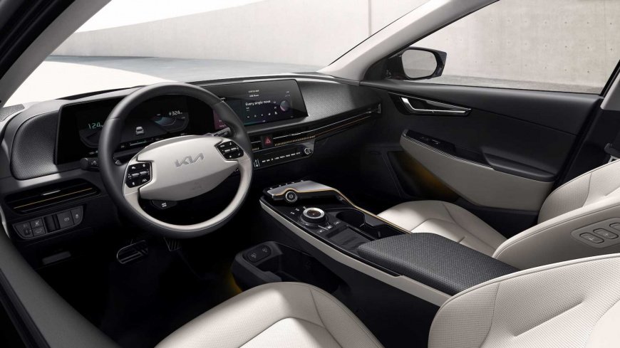В салоне KIA EV6 самым примечательным элементом стал большой изогнутый монитор, объединивший цифровую «приборку», тачскрин мультимедийной системы, а также управляющий всеми агрегатами электромобиля сенсорный пульт HVAC, расположенный в нижней части монитора на центральной консоли.