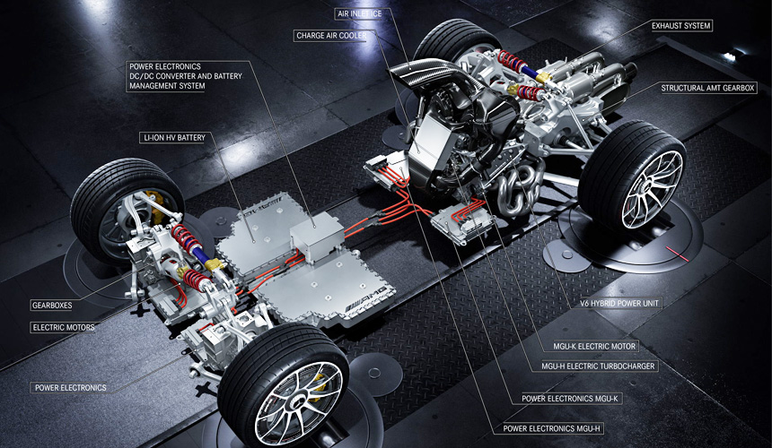 Mercedes-AMG One оснащён гибридным силовым агрегатом смешанного типа от болида Mercedes-AMG W12 F1, на котором выступает сам Льюис Хэмилтон. Его основа — бензиновый V6 объёмом в 1,6 л., оснащённый турбонаддувом, которому помогают 2 электродвигателя.