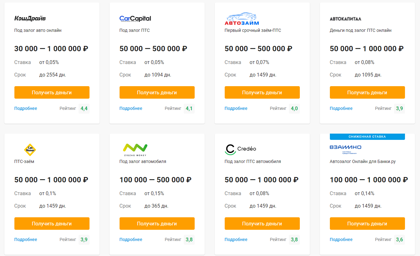 Доступная альтернатива банкам и микрокредитным компаниям – заем под залог авто или паспорта транспортного средства (ПТС). В числе компаний, выдающих такие залоговые кредиты – финансовый сервис CarCapital, стратегический партнер CarPrice. Здесь можно срочно одолжить от 50 до 500 тысяч рублей. Максимальный срок займа – 3 года. Процентная ставка – от 2% в месяц.