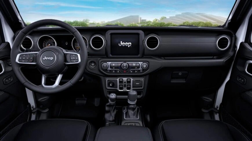 В салоне Jeep Wrangler 80th Anniversary Edition имеются обшитые чёрной кожей кресла, «мультимедийка» с тачскрином диаональю в 8,4 дюйма, поддерживающая сервисы Apple CarPlay и Android Auto, аудиосистема с 9-ю динамиками и много чего другого.