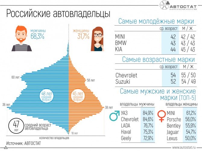 Это сделали специалисты аналитического агентства «Автостат». По собранным ими сведениям, более 68% российских автомобилистов — мужчины. Их средний возраст составляет 48 лет. Автоледи, которые составляют около 32% российских водителей, в среднем, немного моложе — 45 лет.
