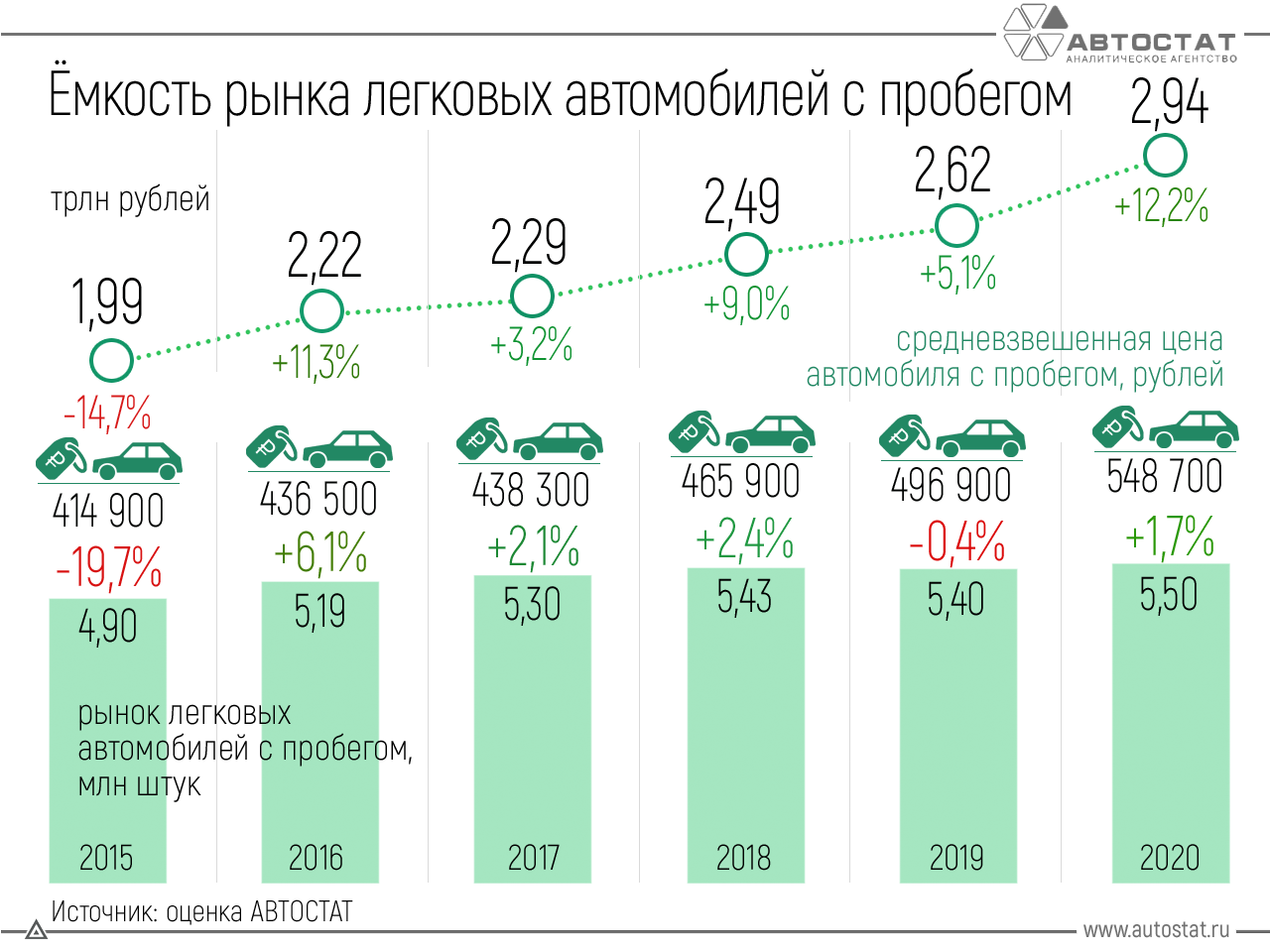 В то же время росли и цены на подержанные машины. Если в 2015 г. за них, в среднем, платили около 415 000 руб., то в прошлом году эта цифра выросла до 548 700 руб. (+32%). В денежном эквиваленте это составило скачок с 1 990 000 000 000 до 2 940 000 000 000 руб.