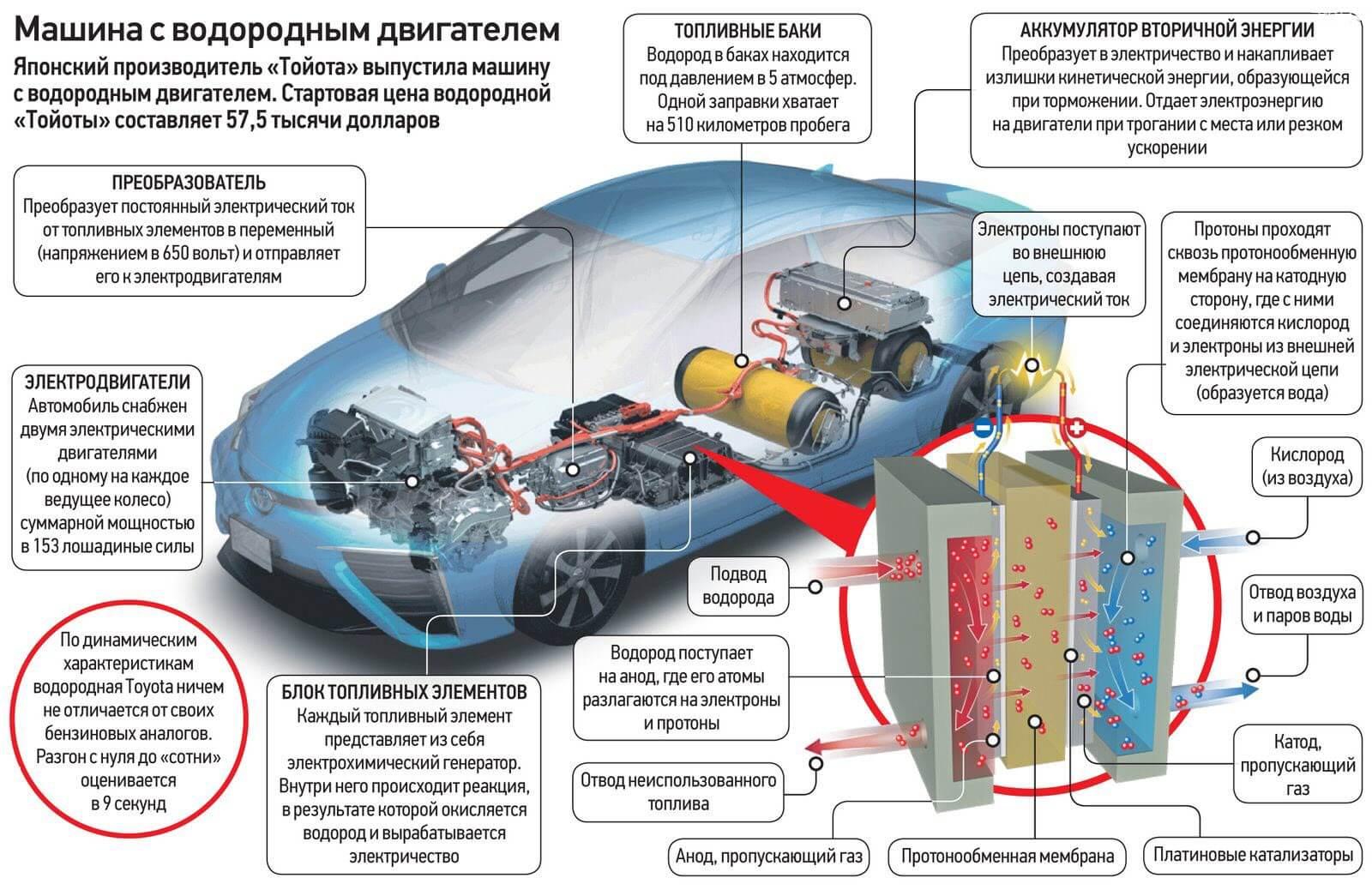 Cама же энергия вырабатывается в результате химической реакции заправленного в машину водорода с кислородом, содержащимся в воздухе.