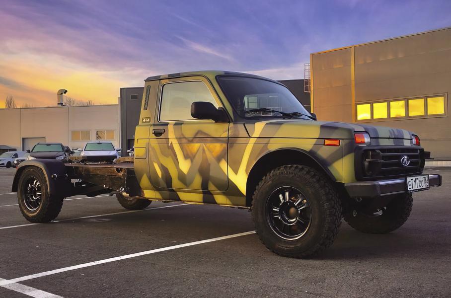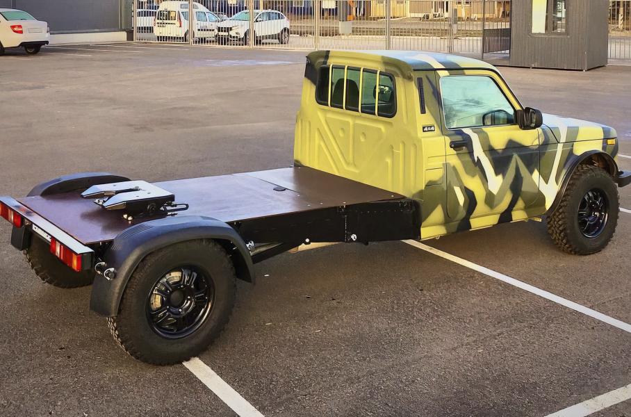 Новинку разработал автор проекта Lada Largus «Карелия» Пётр Груздев. За основу он взял грузовую версию «Нивы», имеющую обозначение ВИС-2346, у которой удлинил раму и оснастил её «седлом» для полуприцепа. База машины при этом увеличилась до 3 100 мм.