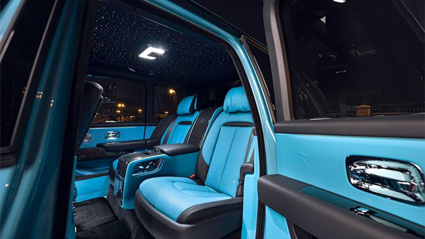 Обшивка салонов таких внедорожников повторяет их окраску. На передней панели смонтированы декоративные вставки из карбона, а на порогах — таблички с надписью: «Черный и яркий. Создано специально для Rolls-Royce Motor Cars Moscow».