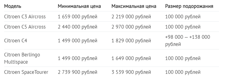 Кроссоверы Citroen C3 Aircross и Citroen C5 Aircross, а также лёгкие коммерческие автомобили Citroen Berlingo Multispace и Citroen SpaceTourer во всех комплектациях, подорожали одинаково - на 100 000 руб.