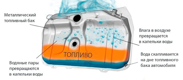 Интенсивнее всего вода накапливается в полупустых ёмкостях — будь то автоцистерна, резервуар АЗС или топливный бак машины. Например, за год эксплуатации на дне топливного бака может накопиться 0,3−1 л. воды в зависимости от его объёма.