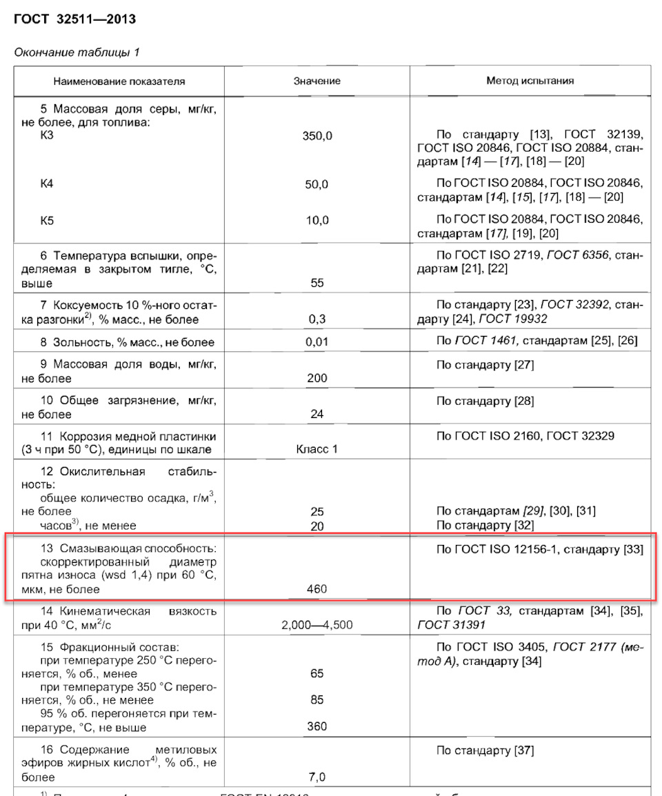По российскому ГОСТ Р 32511−2013, он же — Европейский стандарт EN 590:2009, ДПИ солярки не должен превышать 460 мкм. Однако, Всемирная Топливная Хартия (Worldwide Fuel Charter) — бюллетень, содержащий стандарты качества различных видов топлива — рекомендует меньший размер ДПИ: не более 400 мкм.