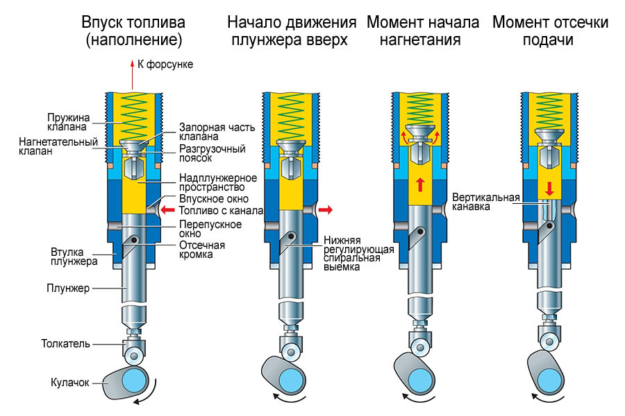Во втулке, внутри которой носится туда-сюда плунжер, имеются 2 отверстия — впускное и выпускное. В 1-е из них поступает солярка, которая в цилиндре сжимается плунжером, а затем под высоким давлением (от 150 МПа) уходит из 2-го отверстия к топливной форсунке, расположенной в цилиндре двигателя.