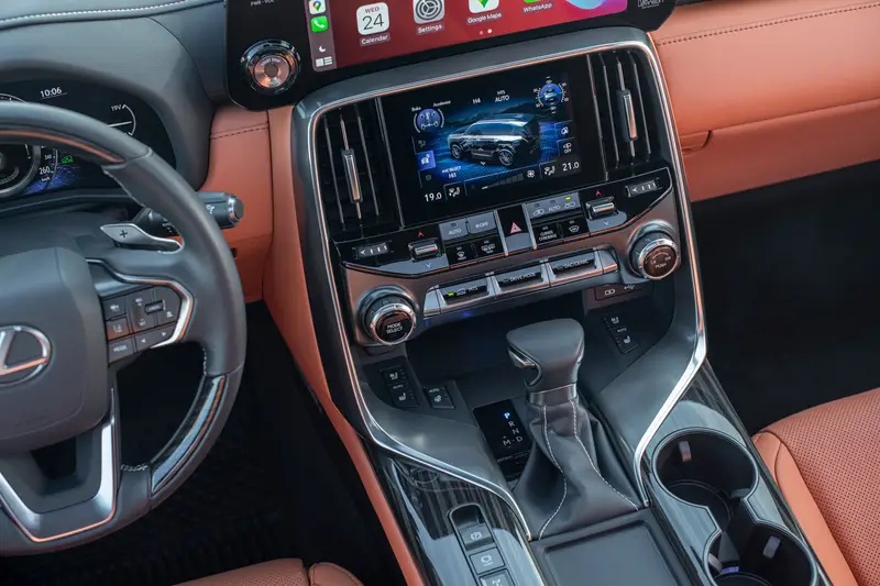 Рассмотрим их оснащение подробнее. Итак, базовая комплектация Lexus LX Executive получила 3-линзовые светодиодные фары, 2 ключа Smart Key, систему Start&Stop, цифровую «приборку», аудиосистему Mark Levinson Premium Surround с 26-ю динамиками, а также мультимедийную систему, поддерживающую сервисы Android Auto и Apple CarPlay. Она имеет сразу 2 тачскрина — «парящий» с диагональю в 12,3 дюйма и 7-дюймовый, вмонтированный в центральную консоль.