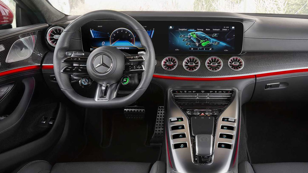 В оснащение Mercedes-AMG GT 63 S E Performance вошли: выдвигающийся активный спойлер, дизайнерские колёса диаметром в 20 либо в 21 дюйм, руль AMG Performance со сдвоенными спицами и фирменная мультимедийная система MBUX, а также много чего ещё.