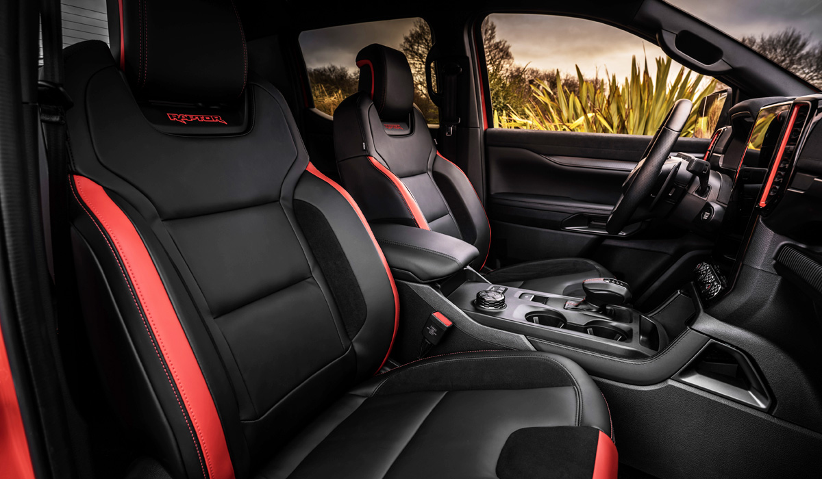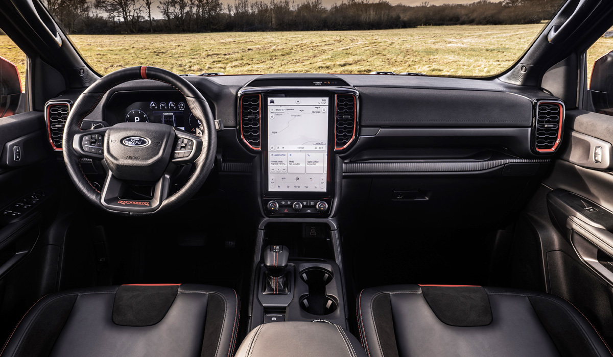 В штатное оснащение нового Ford Ranger Raptor входят матричные светодиодные фары, 17-дюймовые колёса, «обутые» в 32-дюймовые внедорожные шины, развитый защитный обвес, боковые подножки-отбойники, мощная защита картеров мотора, КПП и «раздатки», а также усиленные буксировочные крюки.
