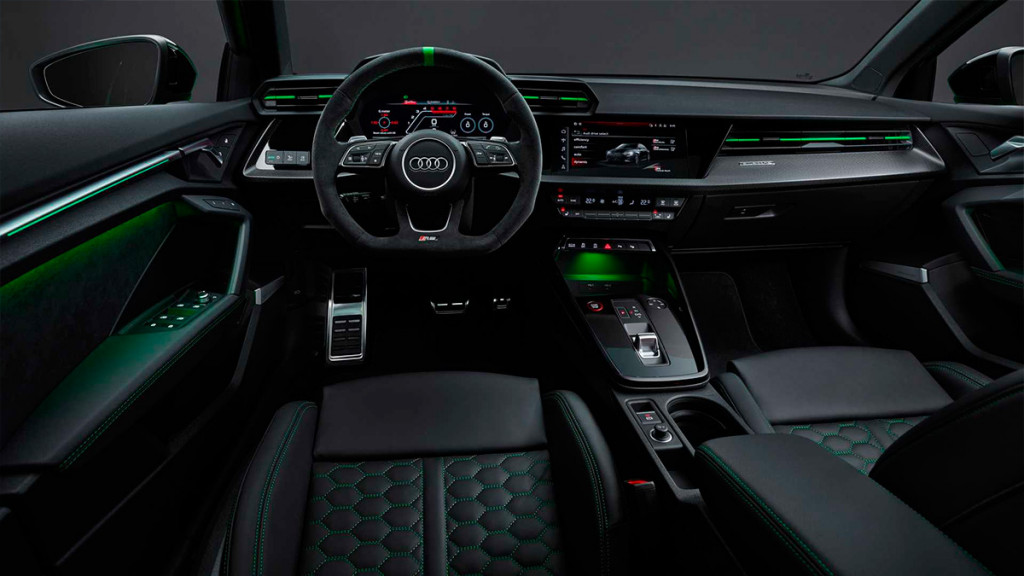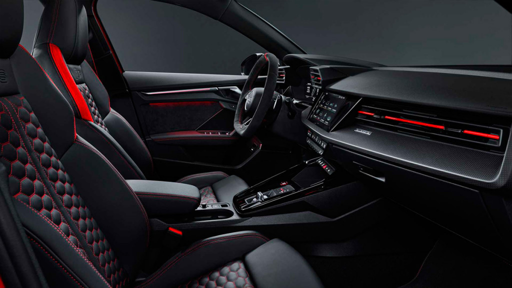 В обширном перечне стандартного оснащения обеих российских версий Audi RS 3 значатся: спортивная подвеска с увеличенным углом развала колес, 19-дюймовые колёса, мощные тормоза с 6-поршневыми суппортами, светодиодные фары, цифровая «приборка» диагональю в 12,3 дюйма, 2-зонный климат-контроль и камера заднего вида,