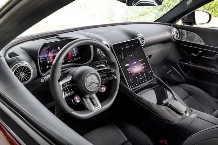 В салоне родстера внимание к себе приковывает новый тачскрин фирменной мультимедийной системы MBUX. Он существенно увеличился в размерах, а также вытянулся по вертикали — как у некоторых электромобилей Tesla.