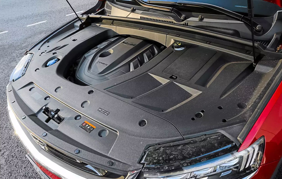 Теперь пора заглянуть Geely Tugella под капот. Открываю его парой движений салонного рычага, при этом радуясь тому, что не нужно искать фиксатор в щели под передней кромкой. Под капотом обнаруживаются рельефные пластиковые крышки, полностью прячущие содержимое моторного отсека.