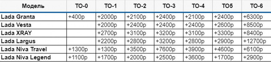 С прибавкой к прежней стоимости технического обслуживания автомобилей Lada можно ознакомиться в расположенной ниже таблице: