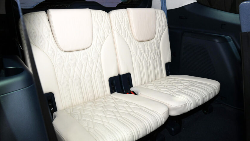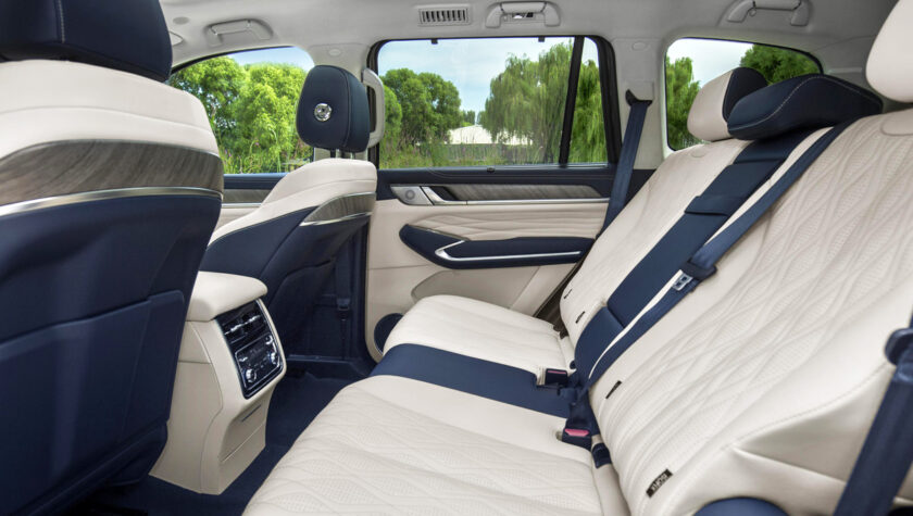 Салон автомобиля получился даже не то, что премиальным, а с претензией на люксовость: обшивка всех сидений выполнена из высококачественной натуральной кожи с несколькими вариантами окраски, включая 2-цветные, и украшен декоративными вставками «под дерево». Единственный вопрос возникает ко 2-му ряду сидений — он почему-то предлагается только в виде цельного «дивана» с отдельной правой частью спинки.