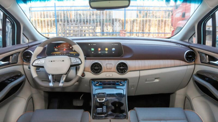 Салон автомобиля выглядит роскошно: пластик отделан под серый гранит и дерево, а обшивка выполнена из натуральной кожи 2-х цветов. Оснащение тоже богатое: виртуальная «приборка», интеллектуальный круиз-контроль, современная мультимедийная система с 5G-интернетом, панорамная крыша и много чего другого.