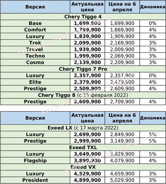 С тем, сколько сейчас нужно платить за продающиеся в России паркетники Chery и Exeed, можно ознакомиться в расположенной ниже таблице:
