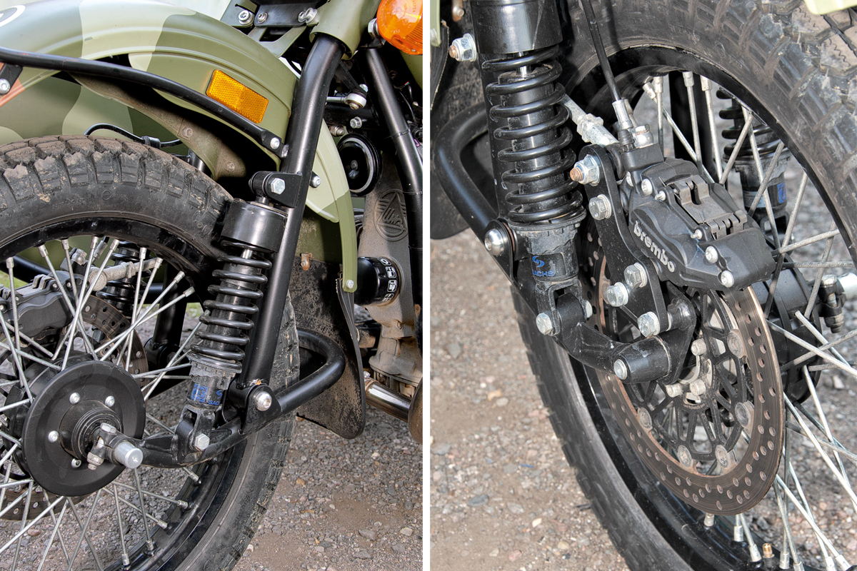 Кроме того, рестайлинговый Ural Gear Up получил новый кованый маятник в передней подвеске и задний тормоз с 2-мя независимыми суппортами. В качестве основного используется 2-поршневой гидравлический, а как «ручник» — механический, с тросовым приводом. Наконец, у мотоцикла появилась более прочная и удобная в использовании центральная подставка.