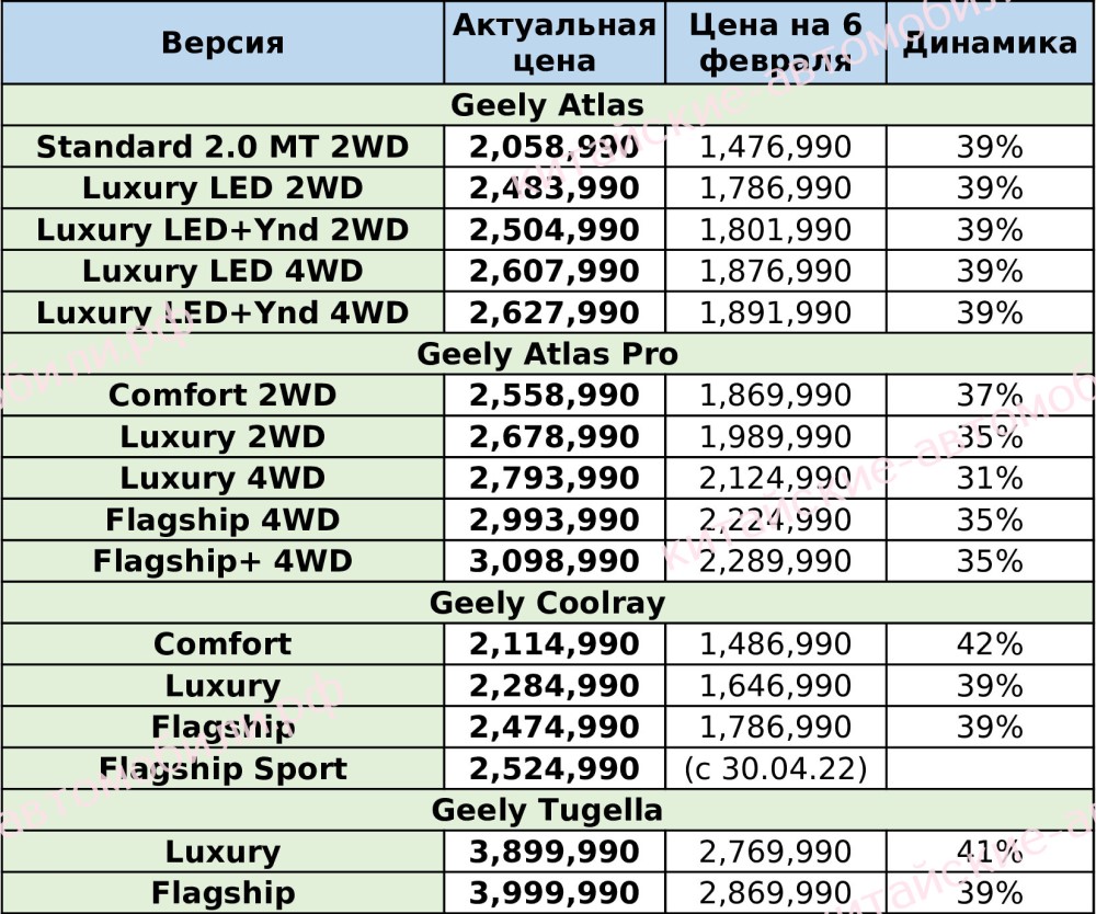 Сейчас все автомобили Geely не получится купить менее, чем за 2 000 000 руб. Например, кроссовер Geely Atlas подорожал на 39% и теперь стоит от 2 058 990 руб., а более «нафаршированный» Geely Atlas Pro теперь стоит на 31−37% больше, чем раньше.