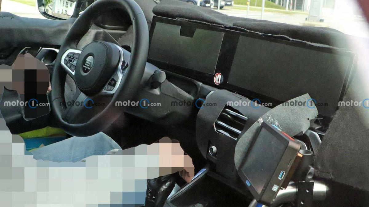 В салоне обновлённого BMW M2 появилась новейшая мультимедийная система iDrive 8 с 2-мя дисплеями: левый — цифровая «приборка», правый — тачскрин. Кроме того, на центральной консоли явно появились сенсорные кнопки управления климат-контролем, пока прикрытые завесой.