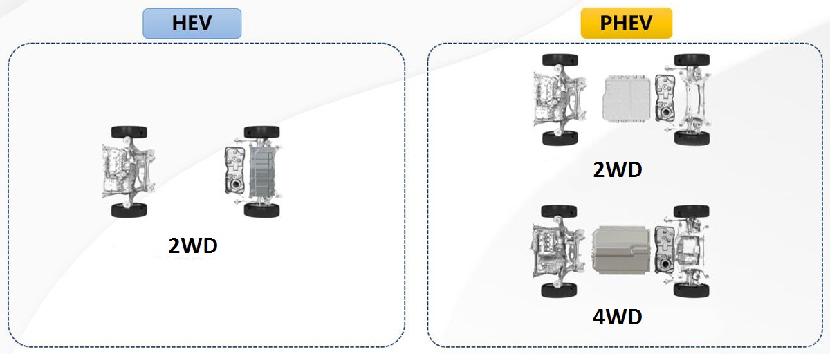 Силовой агрегат L.E.M.O.N. DHT имеет несколько вариантов исполнения. У базового (слева на иллюстрации ниже) — только передний привод и литий-ионный аккумулятор ёмкостью в 1,8 кВт/ч, расположенный под полом багажника. Его зарядка от внешних источников электроэнергии не предусмотрена.