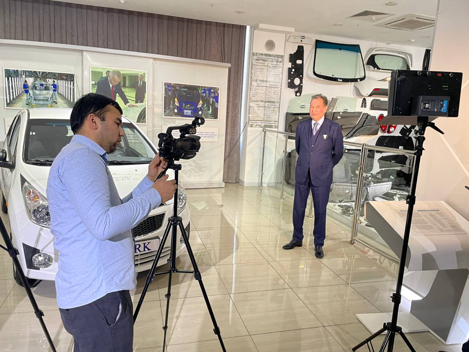 Андерссон в автомобильном музее в Ташкенте на фоне стенда, рассказывающего об уровне локализации – интервью Habar-24 – главного информационного канала Казахстана.