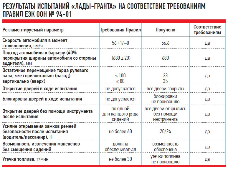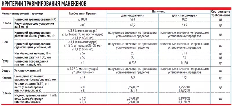 Повреждения, нанесённые манекенам в ходе краш-теста, показаны в расположенной выше таблице. В условиях настоящего ДТП они означают, что водитель и передний пассажир «Гранты» останутся живы, но обязательно окажутся в больнице.