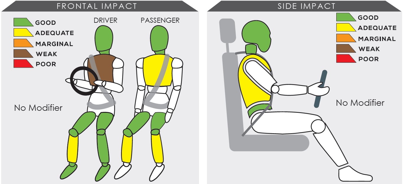 Что касается безопасности ездоков, то она оказалась на весьма высоком для изделий российского автопрома уровне. Напомним, что телесные повреждения, которые при аварии получат сидящие в машине люди, при краш-тестах определяются с помощью оборудованных особыми датчиками манекенов. Степень полученных при ударе повреждений обозначается цветами: