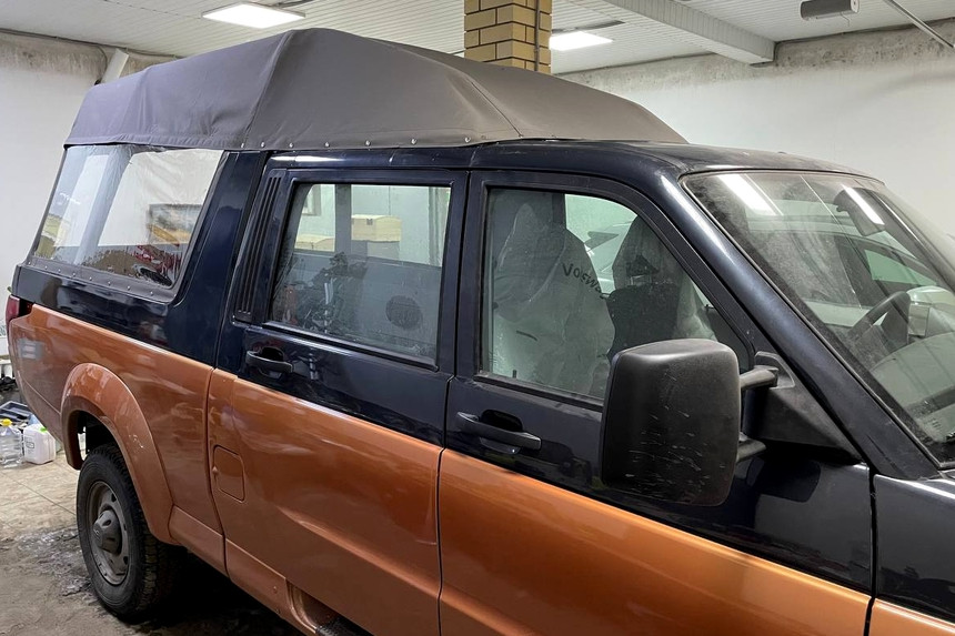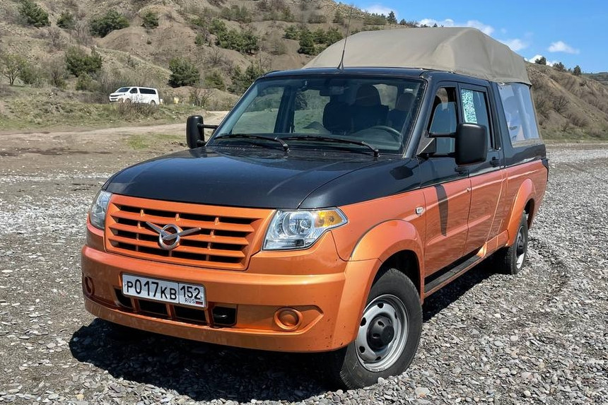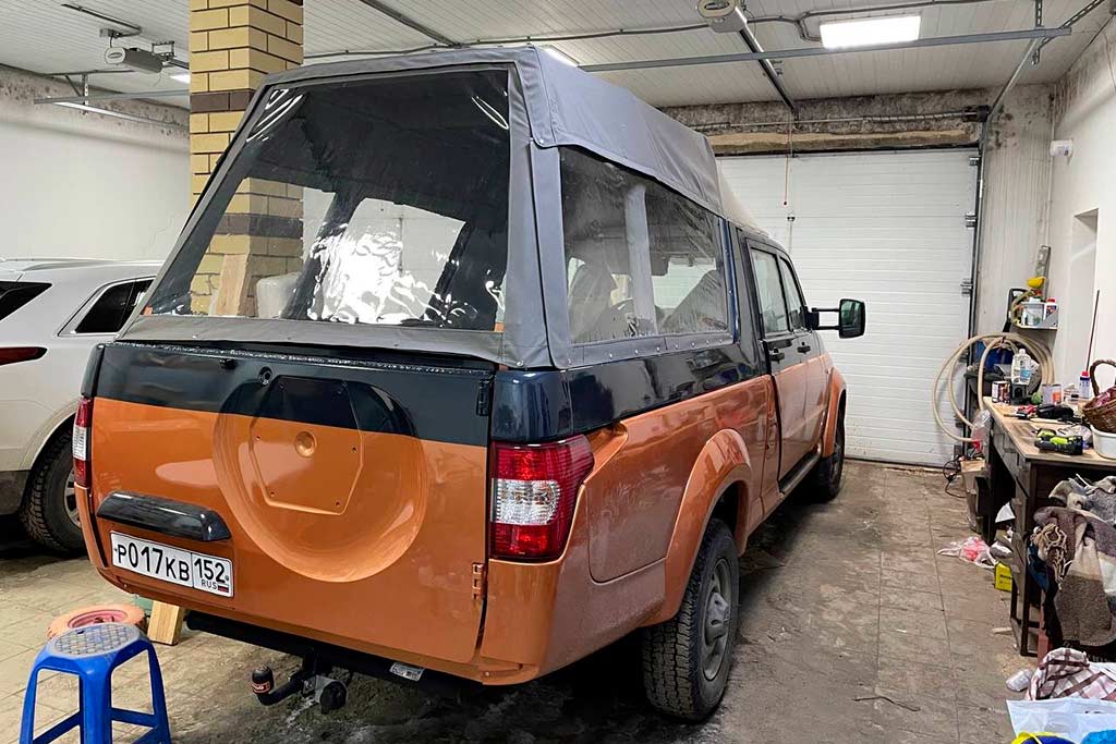 Кузов новинки, вмещающей 8 человек, не считая водителя, имеет складывающийся вручную мягкий тент с большими полиэтиленовыми окнами. Автомобиль также получил задние фонари от внедорожника УАЗ "Патриот" и 2-цветную окраску — чёрный верх и оранжевый низ.