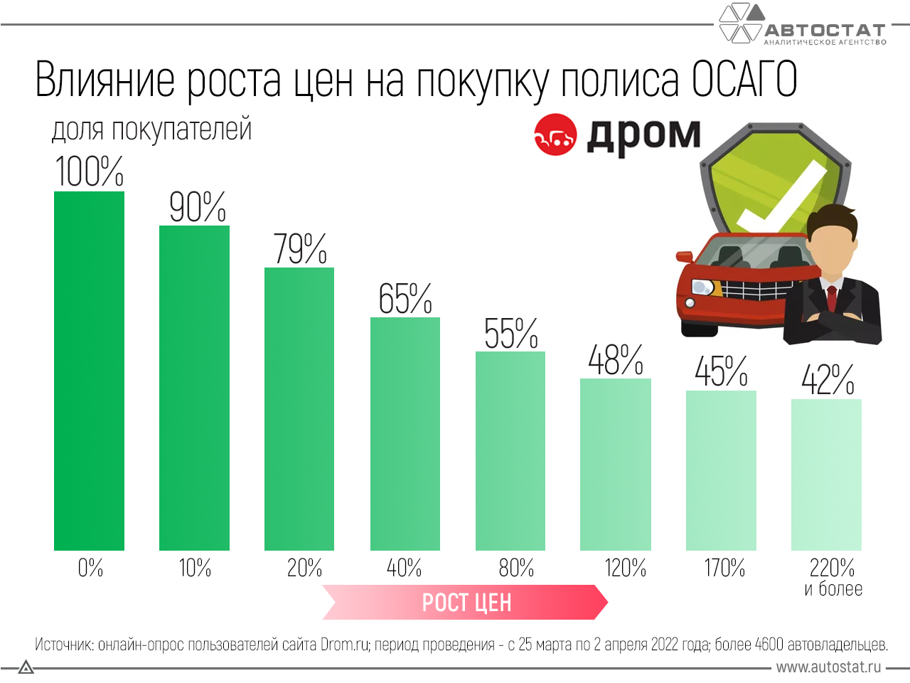 Если стоимость полисов ОСАГО вырастет на 40%, то оформлять их будут только 65% опрошенных. Наконец, при повышении цен на договоры обязательного страхования на 80% их оформят всего 55% респондентов.