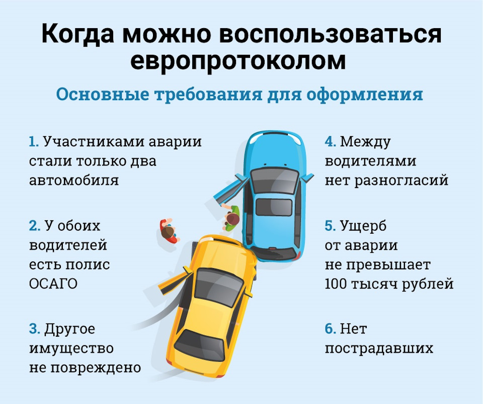 Его можно оформить, если в ДТП повреждения получили только 2 транспортных средства, их водители вписаны в действующие полисы ОСАГО, а также если в аварии нет пострадавших и оба её участника согласны оформить ДТП по европротоколу, без привлечения автоинспекторов.