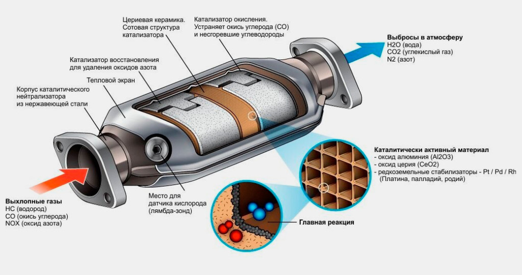 Продукты сгорания бензина нейтрализуются при проходе через специальные мелкие соты, покрытые металлами-катализаторами (палладием, родием, платиной, а иногда – золотом). За заботу об экологии приходится платить и немало: деталь одна из самых дорогих в автомобиле и при этом весьма хрупкая.