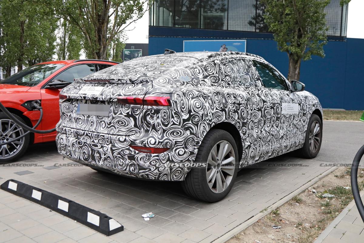 От уже известного «мула» обычного Audi Q6 e-Tron новинка отличается изменённой задней частью. Там появились сильно наклоненная линия крыши, другие задние стойки кузова, большое заднее стекло (правда, почему-то без «дворника» и встроенный в багажную дверь спойлер с дублёром стоп-сигнала.