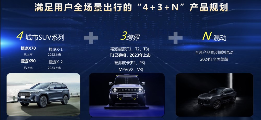 Так, руководство фирмы Jetour, обладающей некоторой автономностью, разработало и представило план развития марки, названный «4+3+N». Это означает появление в производственной программе предприятия 4-х кроссоверов, 3-х внедорожников, некоторого количества гибридомобилей, а также 2 пикапов и минивэна.