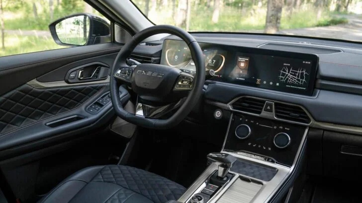 Салон такого автомобиля оформлен в том же стиле, что и у флагманского 7-местного кроссовера марки - Exeed VX. Например, у обеих моделей аналогичные центральные тоннели, селекторы КПП, «шайбы» управления мультимедийными системами и бесконтактные зарядки для гаджетов.