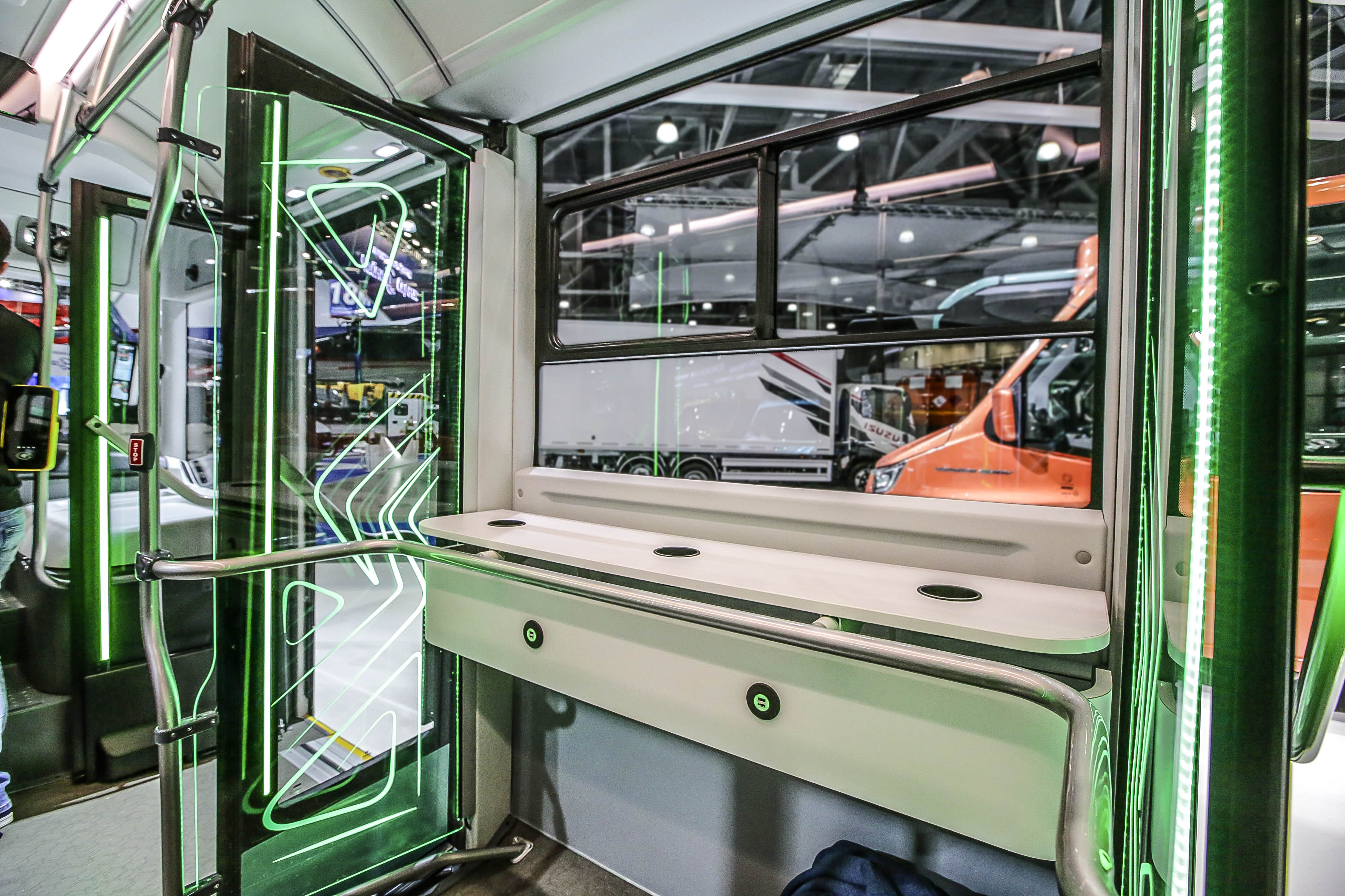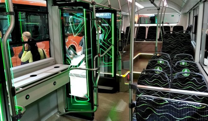 Кроме того, в салоне имеются информационные табло, кнопки связи с водителем, зарядные USB-порты, Wi-Fi-роутер и 2-зонный климат-контроль со множеством воздуховодов, а также светодиодная подсветка, за счёт изменения цвета предупреждающая о закрытии дверей.