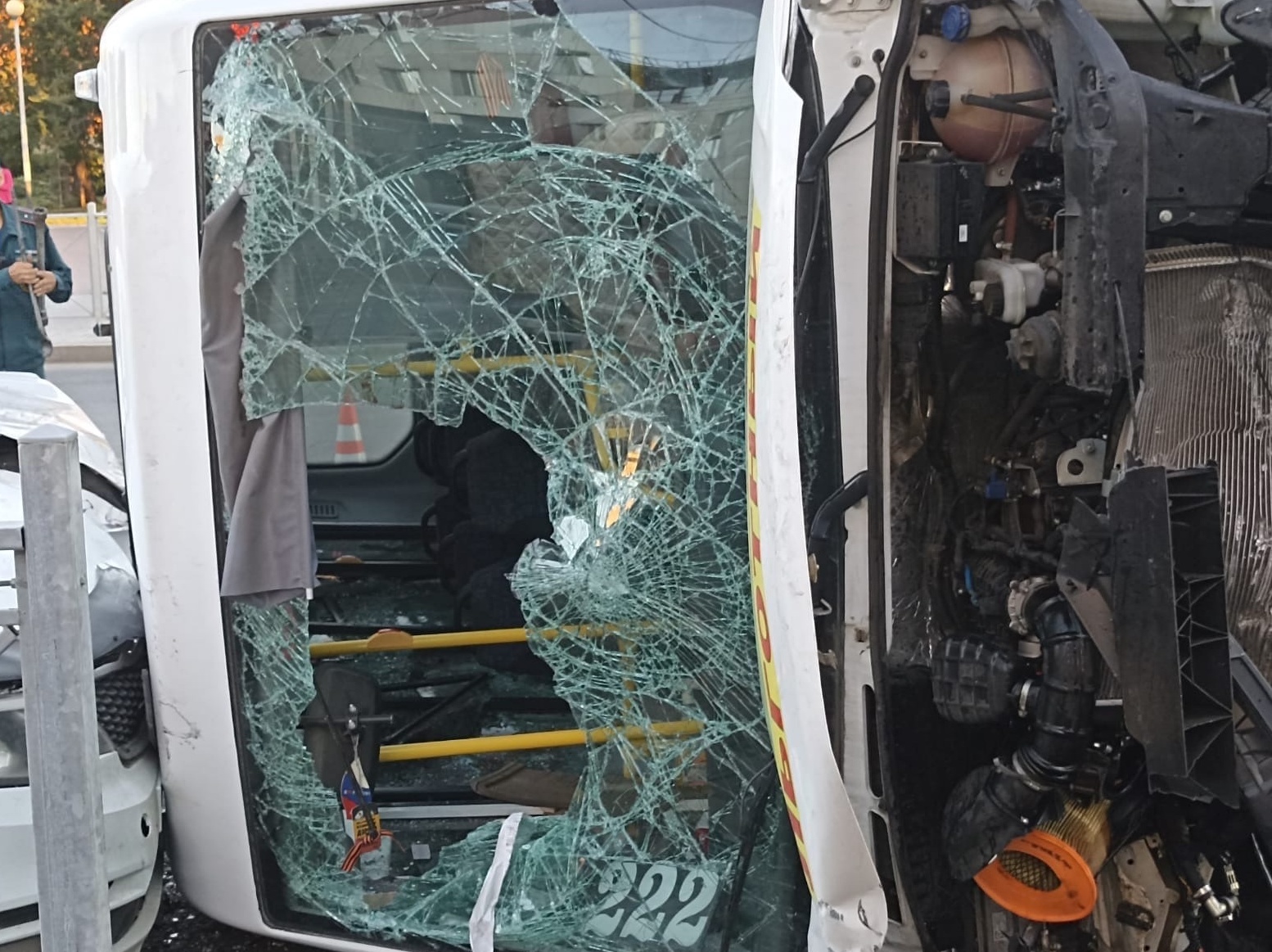 После удара микроавтобус, следовавший по маршруту №222, опрокинулся на проезжей части и задел внедорожник Kia.