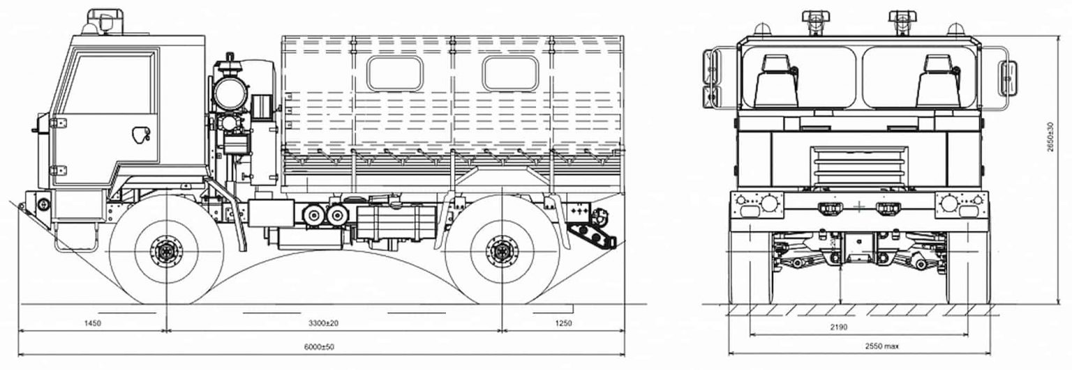 Внешне она почти ничем (кроме, разве что, окраски и кое-каких деталей обвеса) не отличается от своего армейского собрата — простецкая угловатая кабина, мощный силовой бампер, массивные внедорожные шины. Кстати, дизайн кабины немного похож на хорошо известные в СССР и, позже, в РФ чешские грузовики Tatra 800-го семейства (на фото ниже).