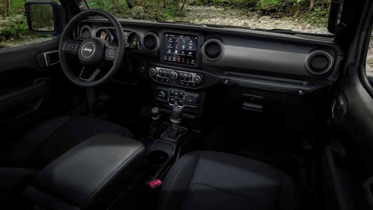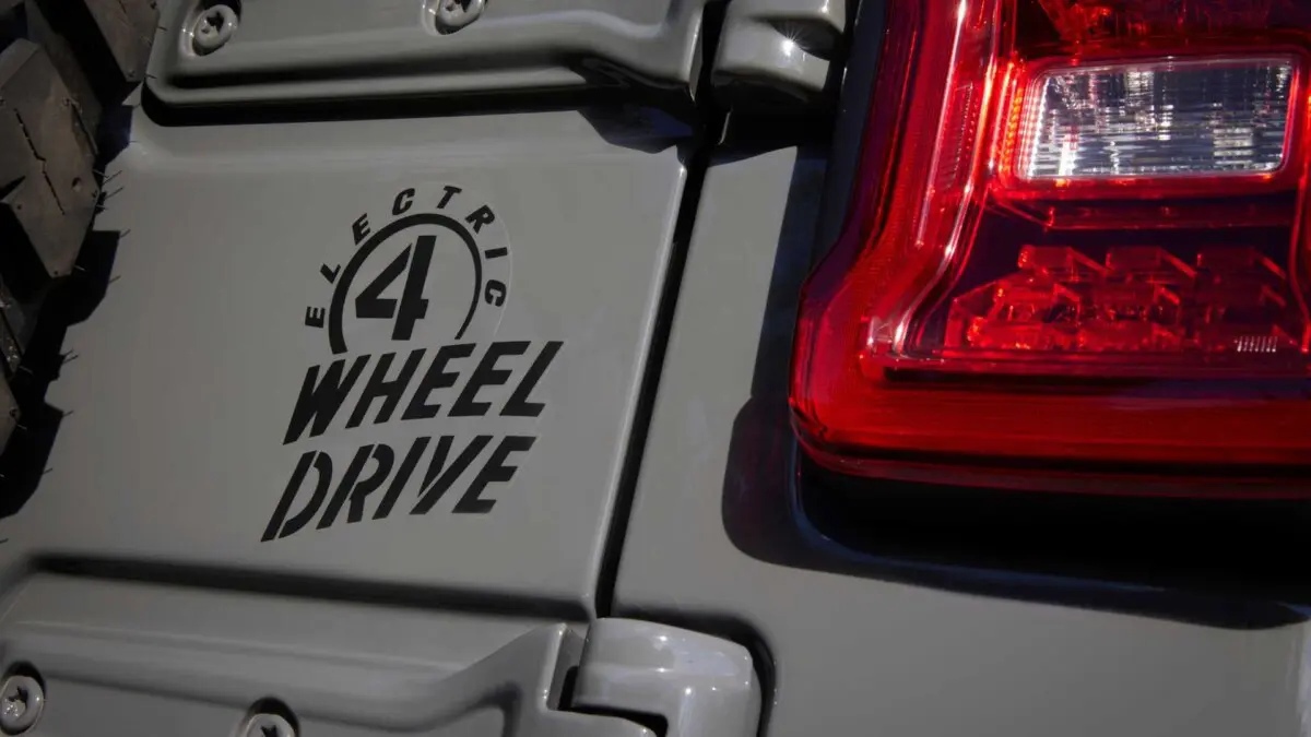Внешние Jeep Wrangler Willys 4xe от прочих модификаций – окрашенные в чёрный глянец колёса и решётка радиатора, между вертикальными планками которой натянута сетка, а также стикеры, обозначающие то, что внедорожник электрифицирован.