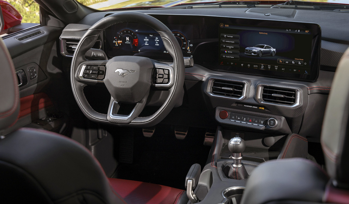Интерьер пони-кара также оформлен по-новому. Там сейчас появился вытянутый по горизонтали дисплей без солнцезащитного козырька, объединивший виртуальную «приборку» диагональю в 12,4 дюйма и тачскрин фирменной мультимедийной системы Sync 4, диагональ которого составляет 13,2 дюйма.