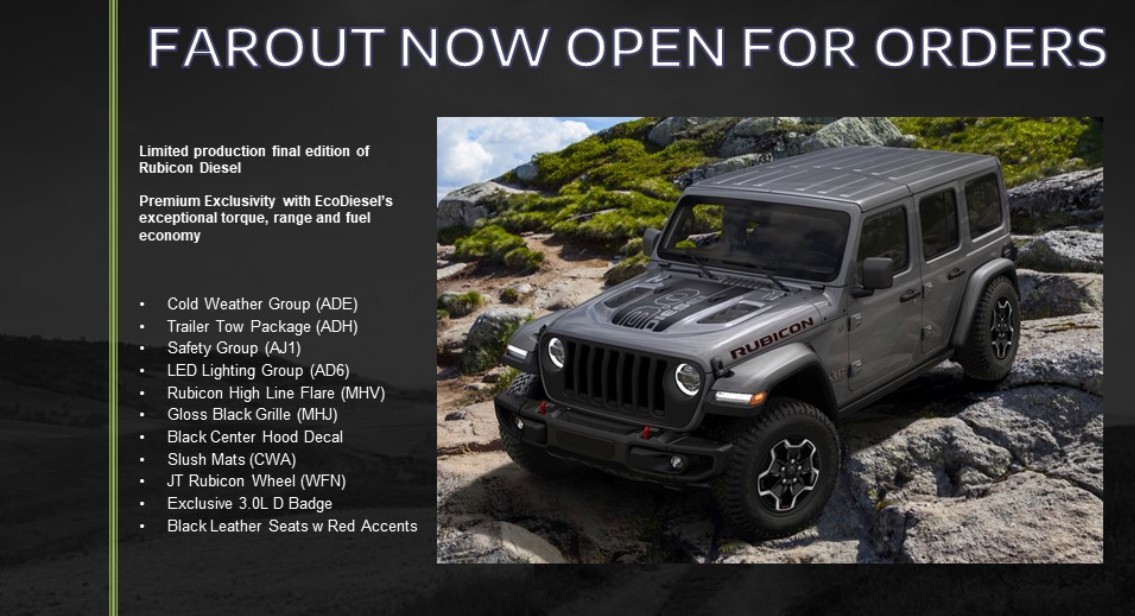 Сейчас заокеанская фирма приступила к выпуску финальной версии этого автомобиля, получившей название Jeep Wrangler Rubicon Diesel Farout Edition. Под её капотом установлен стандартный для работающей на солярке модификации силовой агрегат.