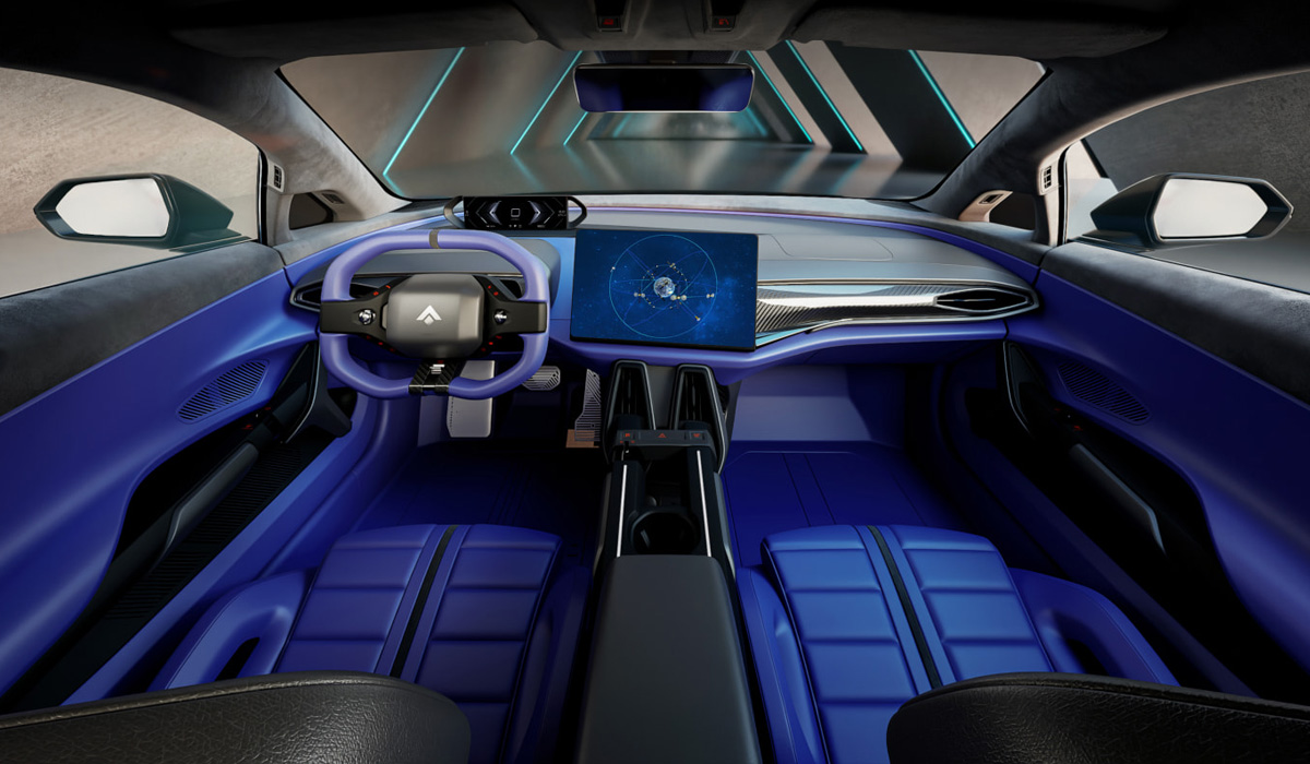 В оснащение 2-местного электромобиля входят оснащенные электроприводом подъёмные двери в стиле Lamborghini, прямоугольный штурвал вместо привычной «баранки», цифровая «приборка» диагональю в 8,8 дюйма, а также передовая мультимедийная система с тачскрином диагональю в 14,6 дюйма и многое другое.