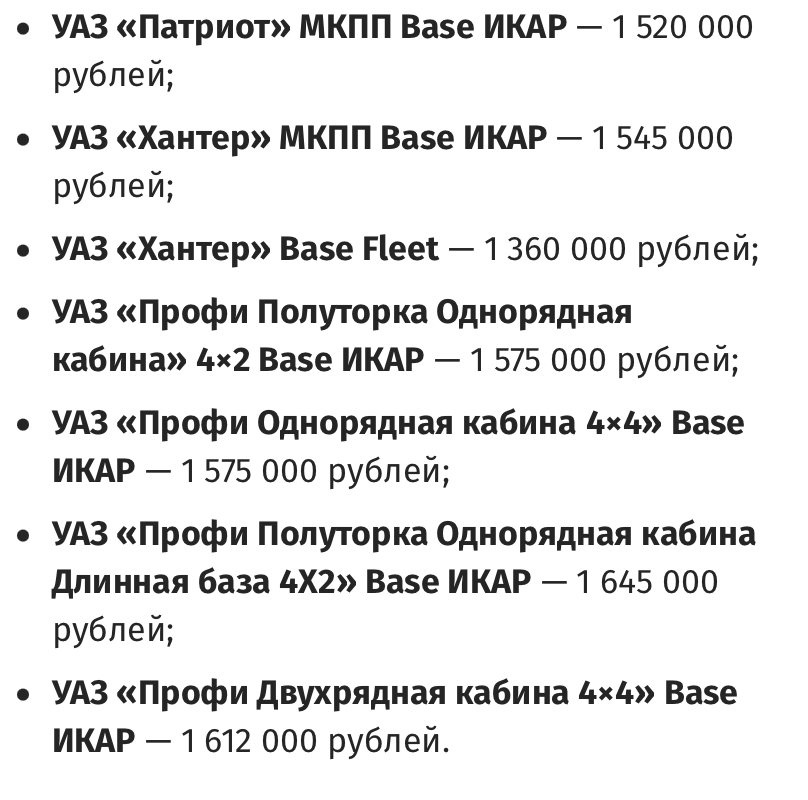 Флагман предприятия, УАЗ «Патриот», и созданный на его базе УАЗ «Пикап» получили одинаковые изменения. Их упрощённые модификации, получившие название «Base ИКАР», лишены водительских подушек безопасности и южнокорейских КПП фирмы Dymos. На отдельных автомобилях также может не быть системы «ЭРА-ГЛОНАСС», ABS и EBD.
