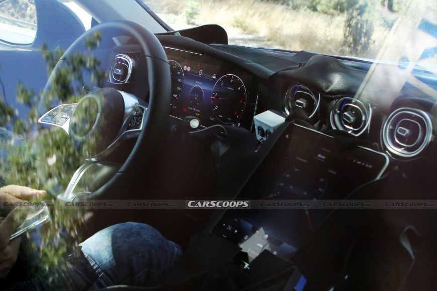 Фотографам удалось заглянуть и в салон спорткара. Там обнаружились 3-спицевой многофункциональный руль с физическими, а не сенсорными кнопками, довольно большая цифровая «приборка», традиционно прикрытая солнцезащитным козырьком, а также большой тачскрин-«планшет», установленный на центральной консоли под вентиляционными дефлекторами.