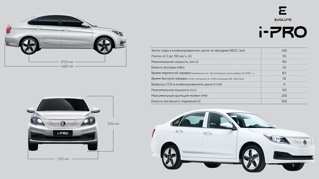 Evolute I-PRO оснащён установленным на передней оси 150-сильным двигателем и литий-ионным аккумулятором ёмкостью в 53 кВт/ч, обеспечивающим пробег на полной зарядке в 420 км. Максимальная скорость «зелёной» новинки составляет 150 км/ч, а разгон с места до 100 км/ч занимает 9,9 сек.