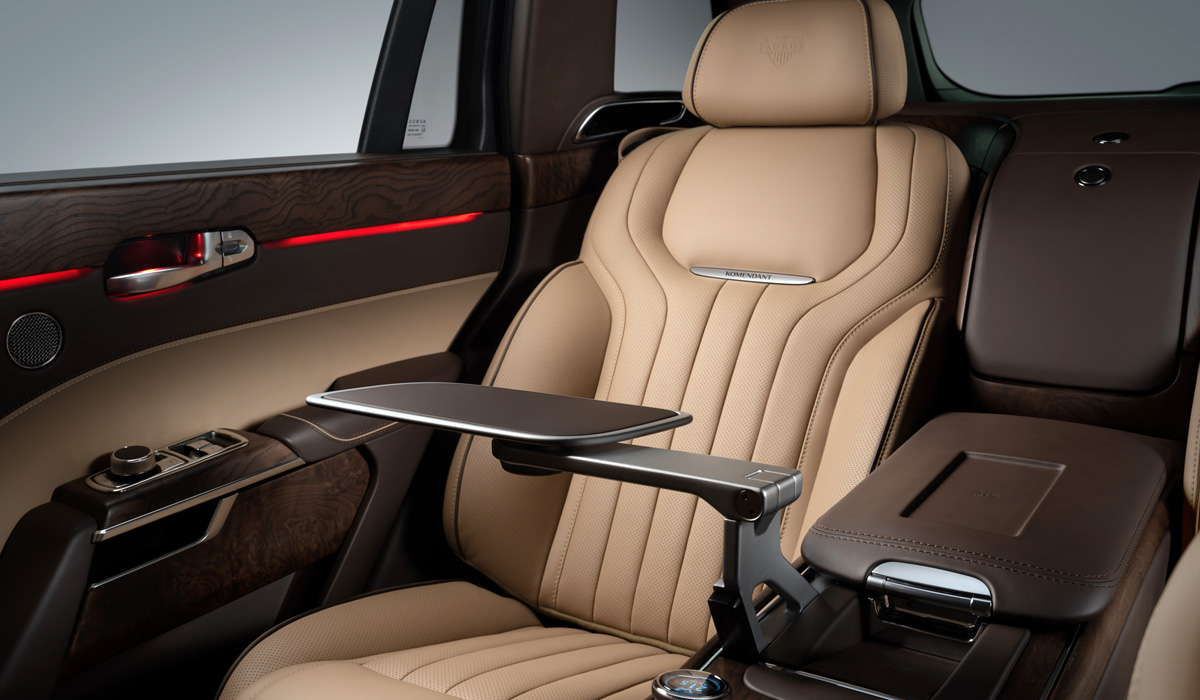 В заднем ряду Aurus Komendant установлена пара раздельных кресел с индивидуальным климат-контролем, раскладными столиками, отсеком для напитков в центральном подлокотнике, а также 2-мя экранами, вмонтированными в спинки передних кресел и управляемыми «шайбами» на дверных картах.