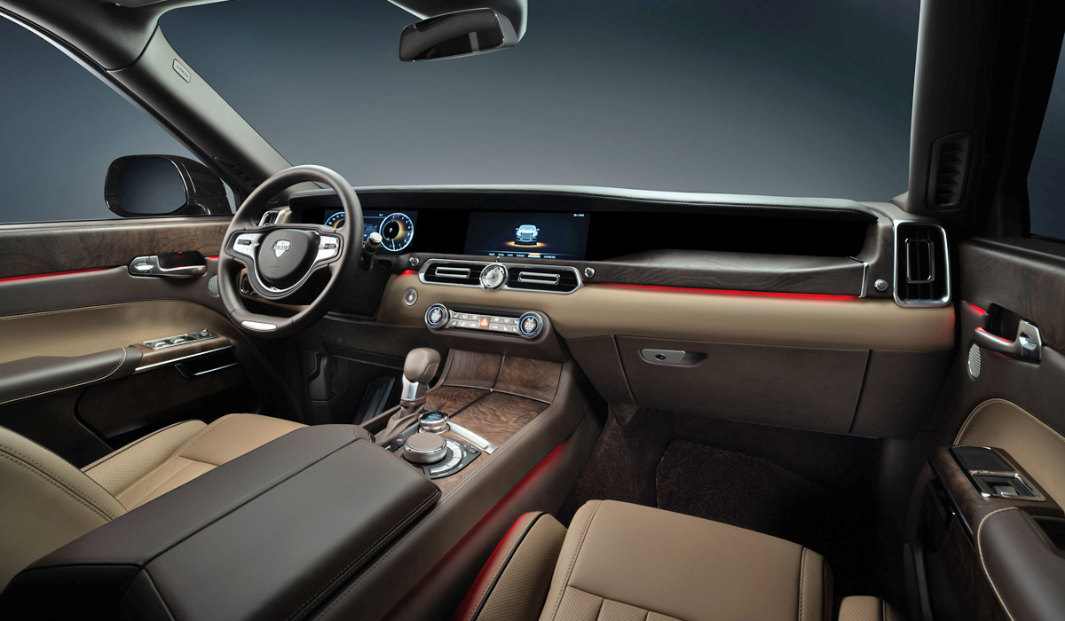 Пора заглянуть в салон автомобиля. Он оформлен ожидаемо дорого, но в консервативном стиле - большинство дизайнерских решений позаимствовано у Aurus Senat – например, комбинированная обшивка из кожи Nappa и алькантары, а также декоративные вставки из шпона, сделанного из ценных пород дерева.