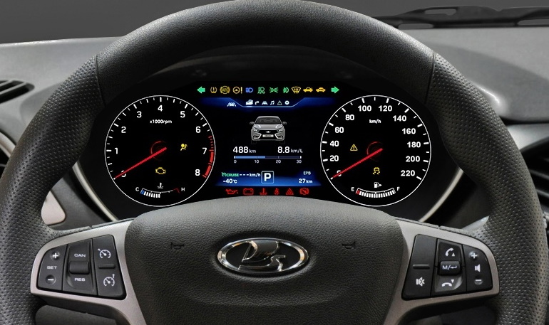 Есть свежие данные и по виртуальным «приборкам», которыми будут оснащаться топовые комплектации Lada Vesta NG. Эти приборные панели будут показывать не только скорость, обороты и температуру двигателя, но и динамическую карту со всеми пробками и ДТП, позволяющую водителю составить оптимальный маршрут поездки.
